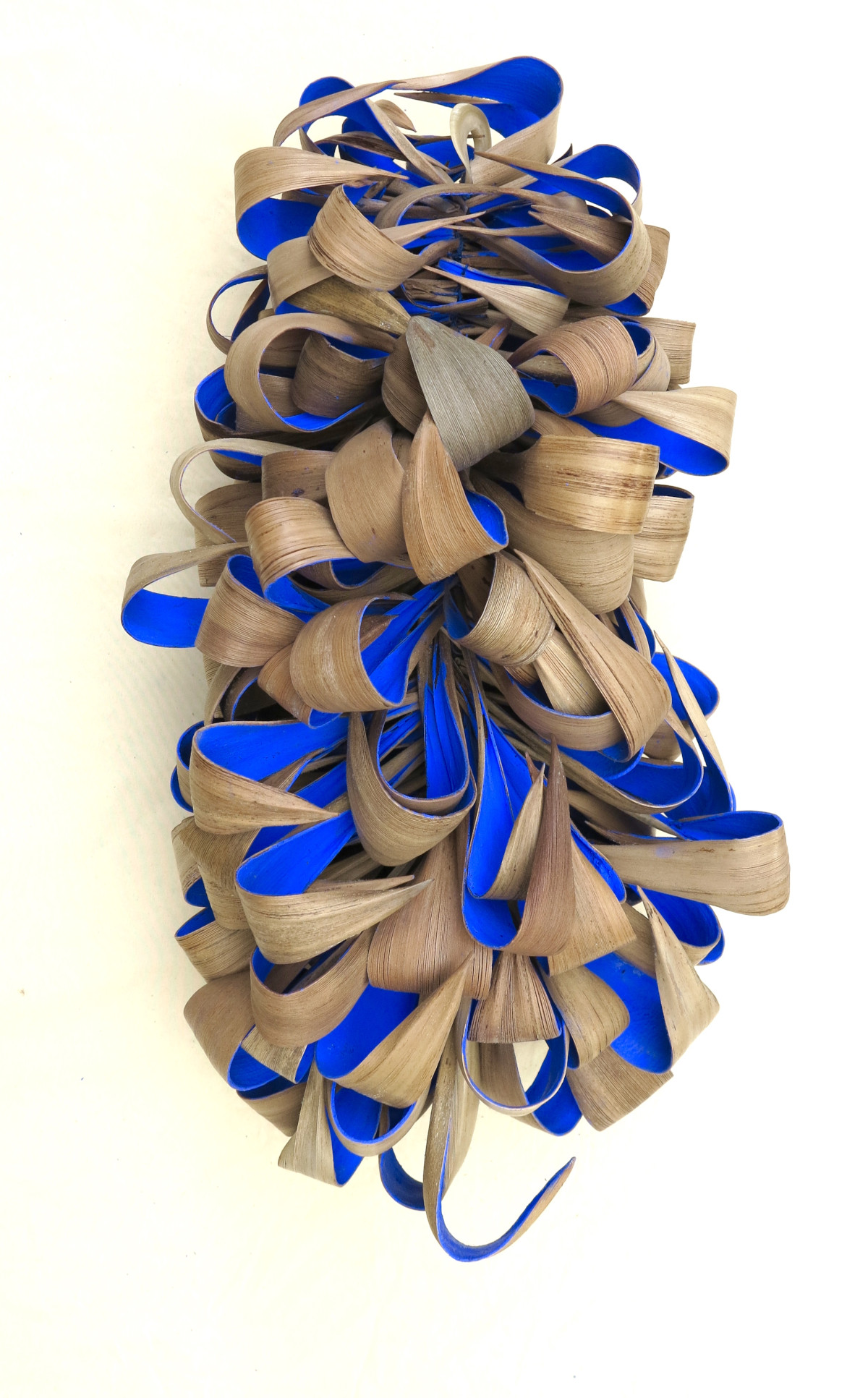 Capa coco dobrado, tingidos internamente com pigmento azul Yves Klein, agrupados e amarrados com linha encerada, formando um cacho. Acabamento de argola chifre.