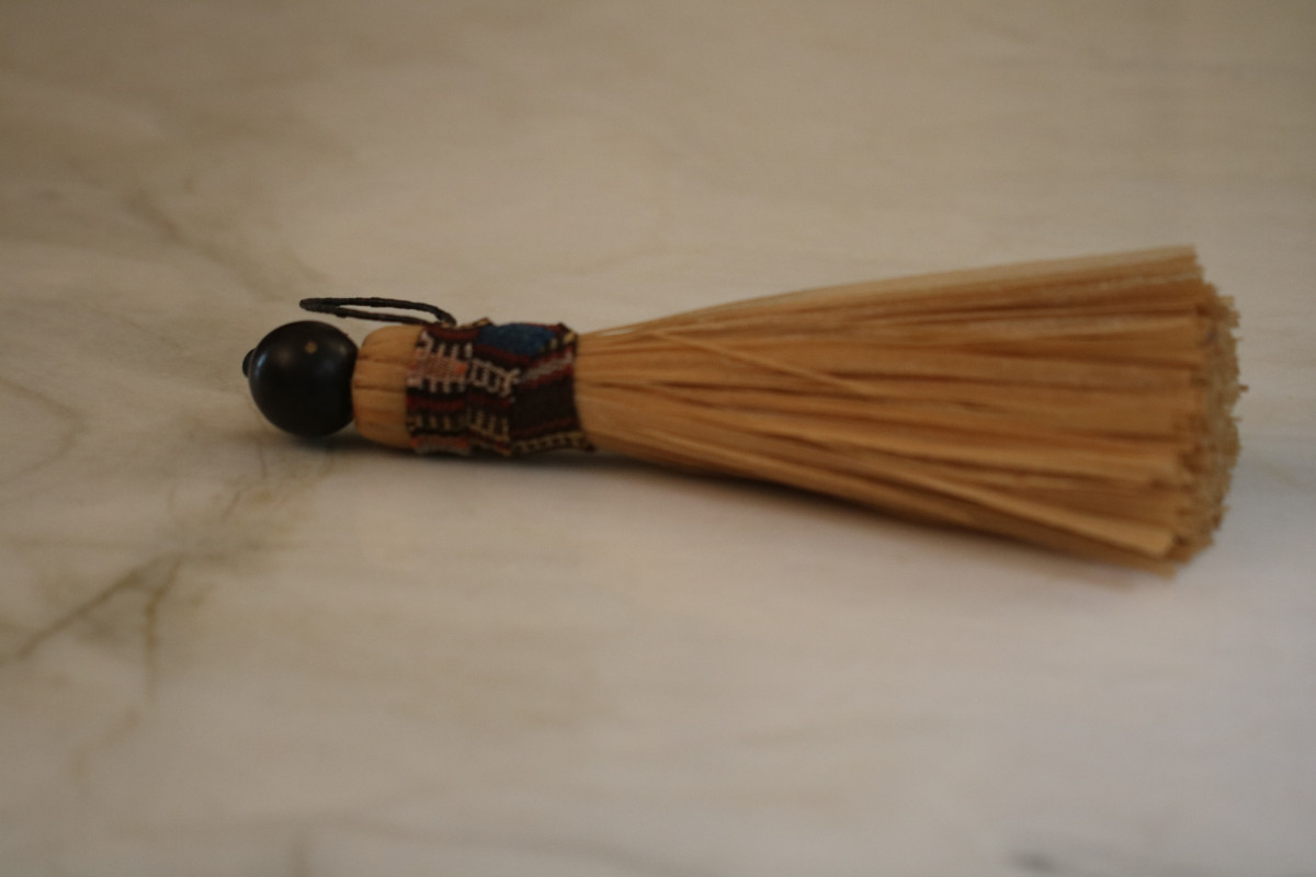 Vassoura de Envira amarrada por fragmentos de tapete by Kamy, acabamento em Tucumã. Utilitária, decorativa, além de amuleto para limpar ambientes.