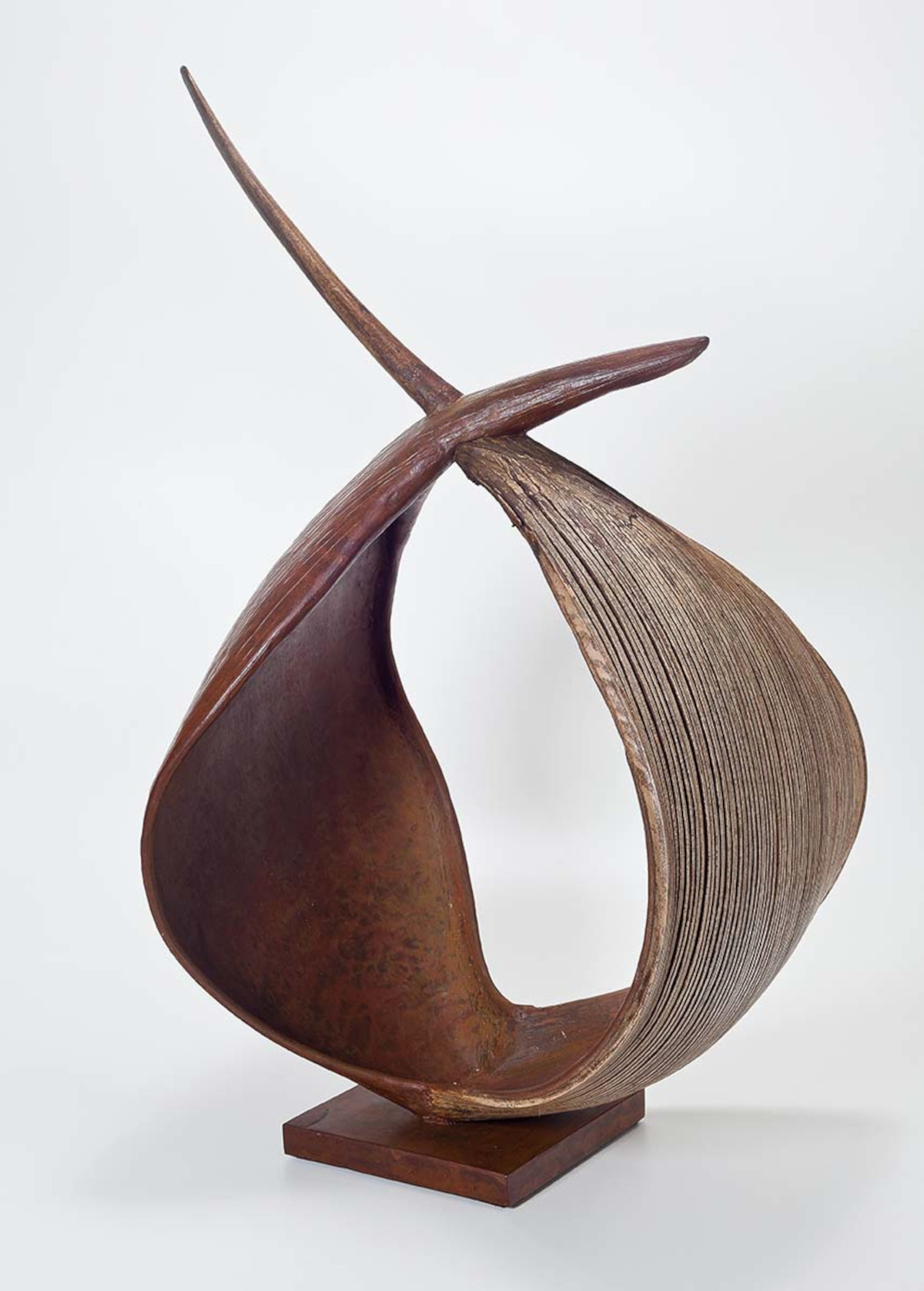 Bráctea do Inajá e bráctea de ferro conectadas formando uma escultura.