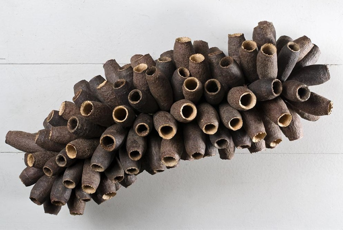 Agrupamento do fruto Jequitibá amarrados com linha encerada, formando um cacho. Acabamento de argola chifre.
