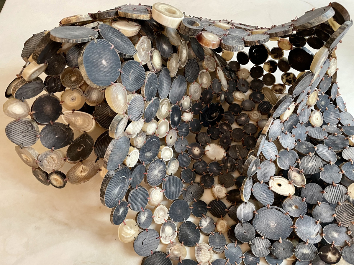 Segmentos de chifre conectados com linha encerando formam um painel com diversas possiblidades de exposição.
