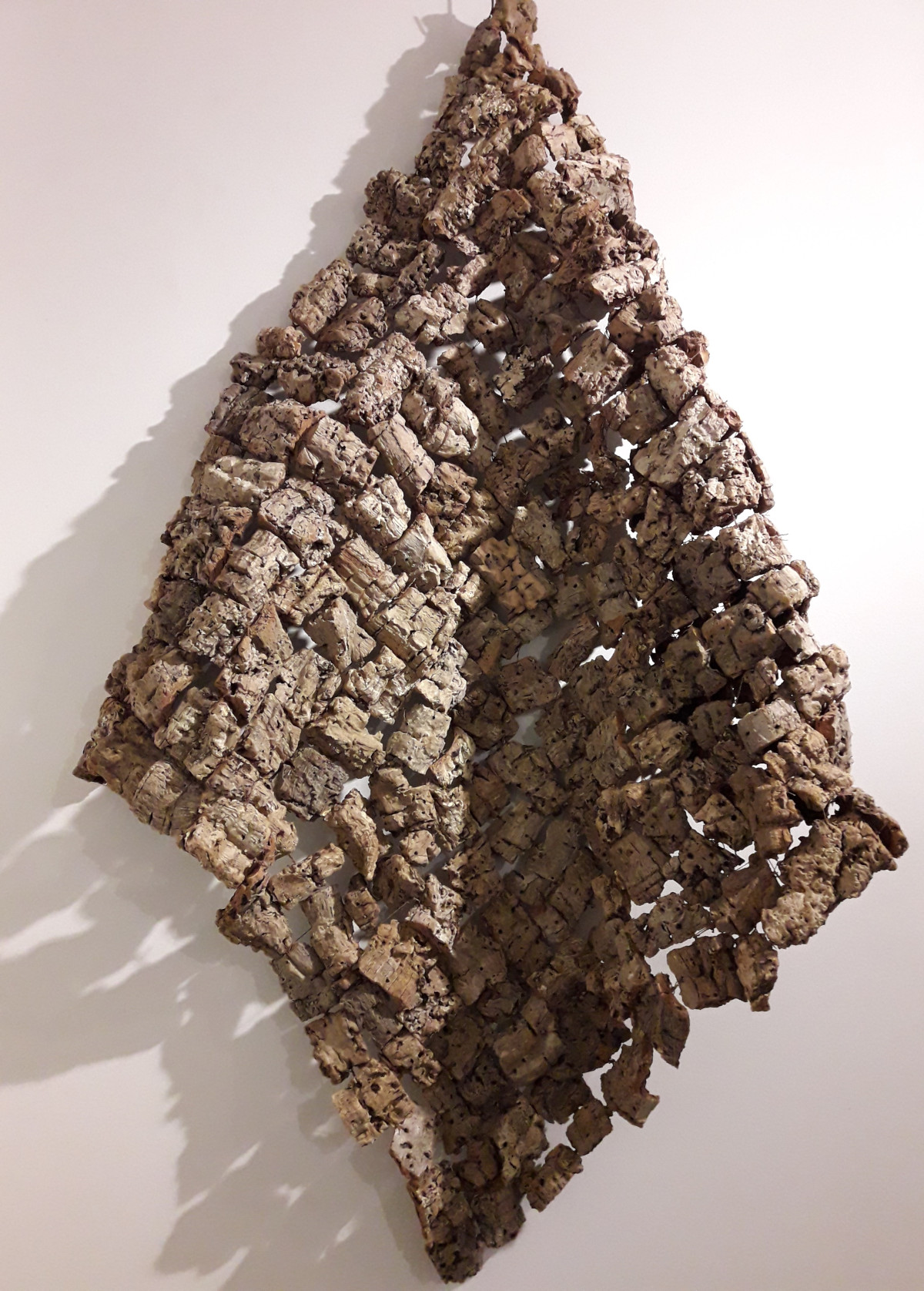 Cascalho de Cortiça conectados com linha encerada formam um painel tridimensional, com diversas possibilidades de exposição.