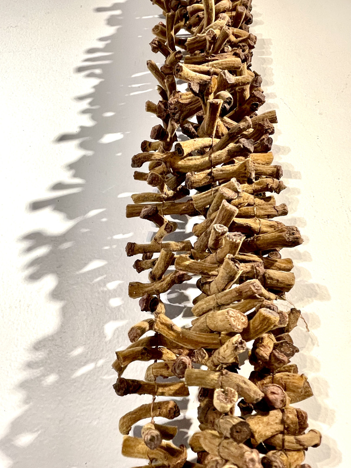 Sequência de talo da flor do Imbiruçu entremeadas com nó formando uma tira. Acabamento de argola chifre.
